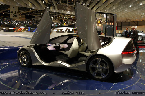 La Pininfarina Sintesi présente sur le stand de l'italien ne sera bien entendue jamais mise en production. Ses larges surfaces vitrées et son capot très court sont possibles grace à la propulsion par pile à combustible, très compacte.